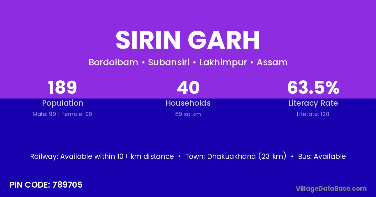 Dhakuakhana (23 km) is the nearest town to Sirin Garh village for major economic activities and is located approximately 23 km away.