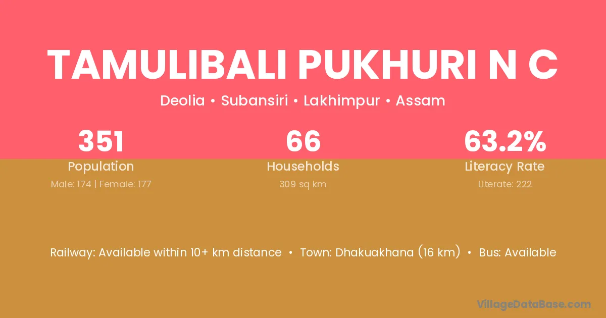 Tamulibali Pukhuri N C village has a total population of 351 people, of which 174 are males and 177 are females.
