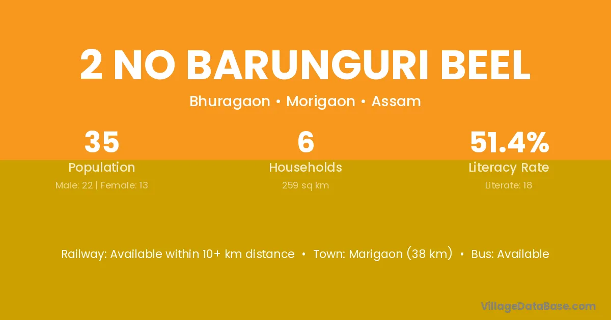 2 No Barunguri Beel village has a total population of 35 people, of which 22 are males and 13 are females.