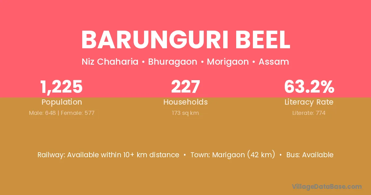 Marigaon (42 km) is the nearest town to Barunguri Beel village for major economic activities and is located approximately 42 km away.