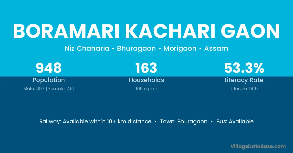 Boramari Kachari Gaon village has a total population of 948 people, of which 497 are males and 451 are females.