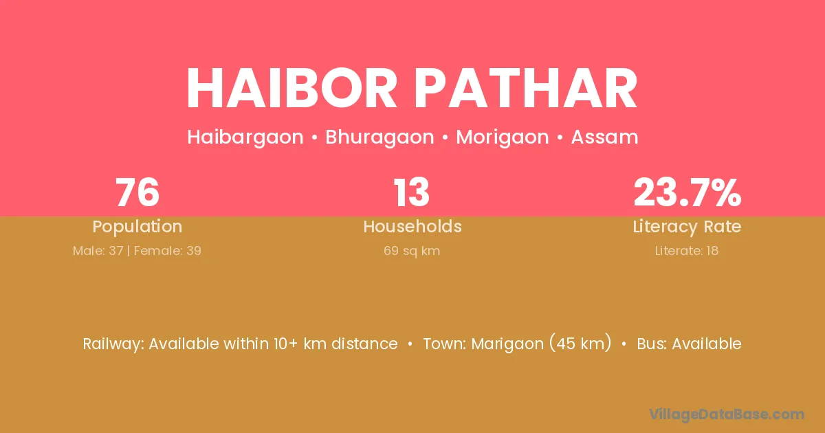 Marigaon (45 km) is the nearest town to Haibor Pathar village for major economic activities and is located approximately 45 km away.