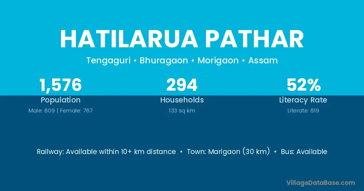 Marigaon (30 km) is the nearest town to Hatilarua Pathar village for major economic activities and is located approximately 30 km away.