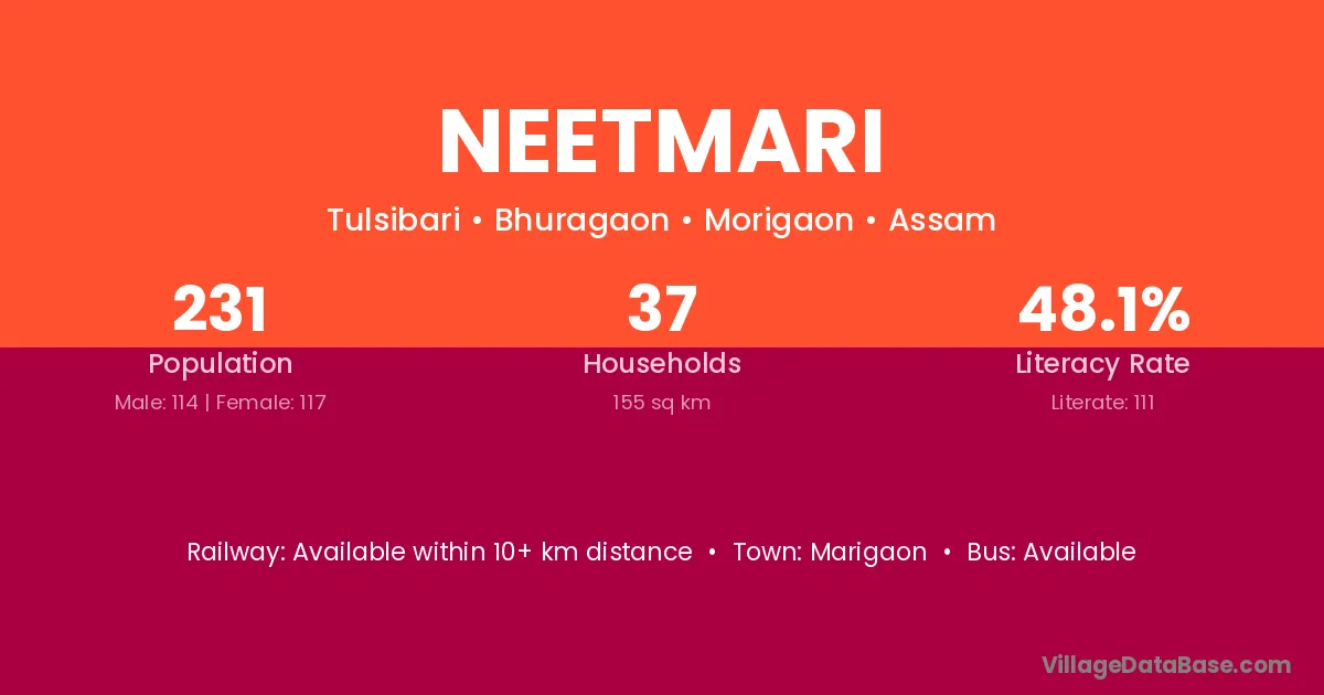 Neetmari village has a total population of 231 people, of which 114 are males and 117 are females.