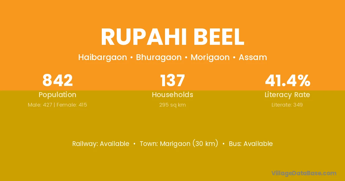 Rupahi Beel village has a total population of 842 people, of which 427 are males and 415 are females.