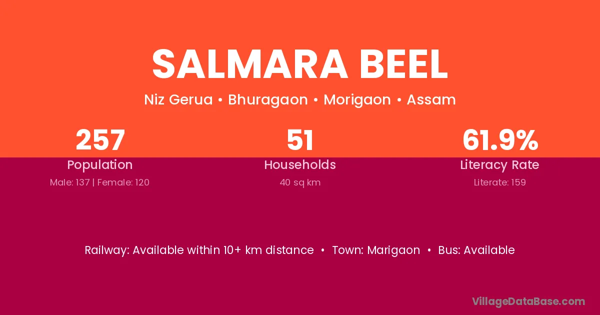 Salmara Beel village has a total population of 257 people, of which 137 are males and 120 are females.