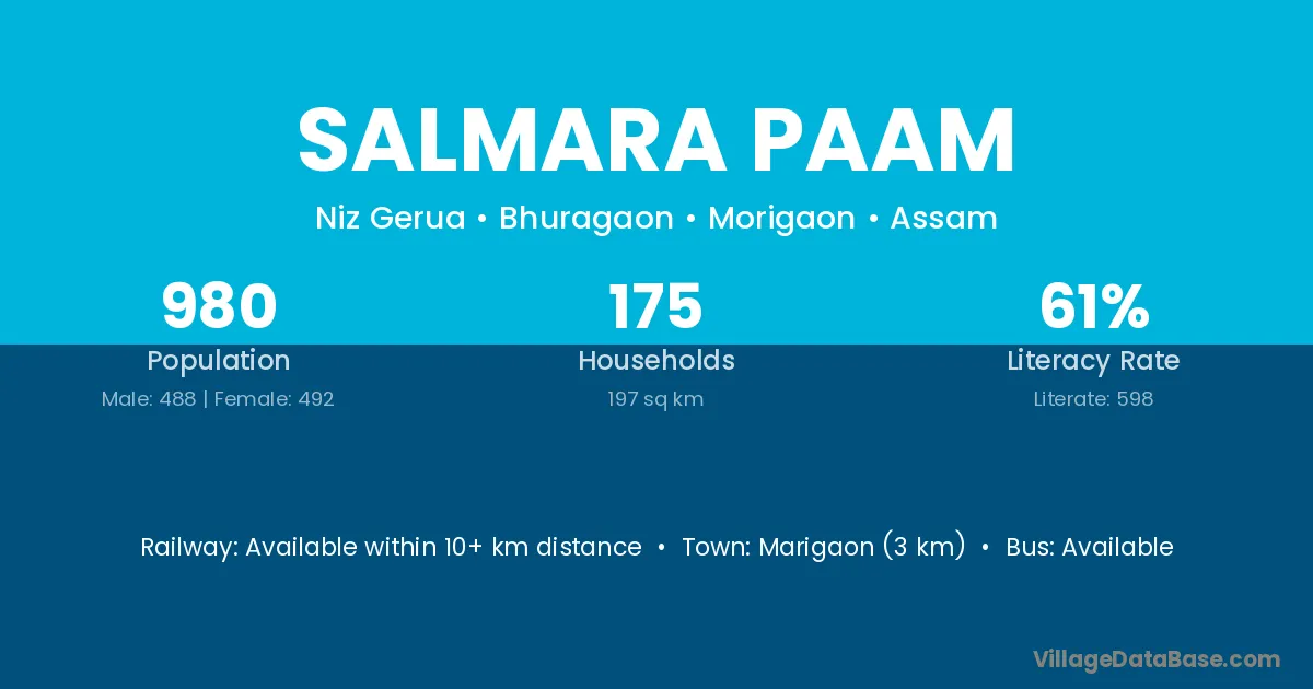 Marigaon (3 km) is the nearest town to Salmara Paam village for major economic activities and is located approximately 3 km away.