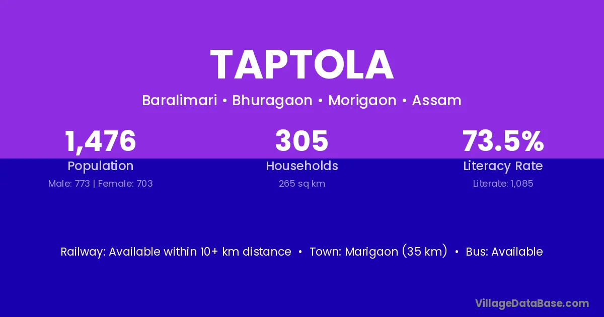 Marigaon (35 km) is the nearest town to Taptola village for major economic activities and is located approximately 35 km away.