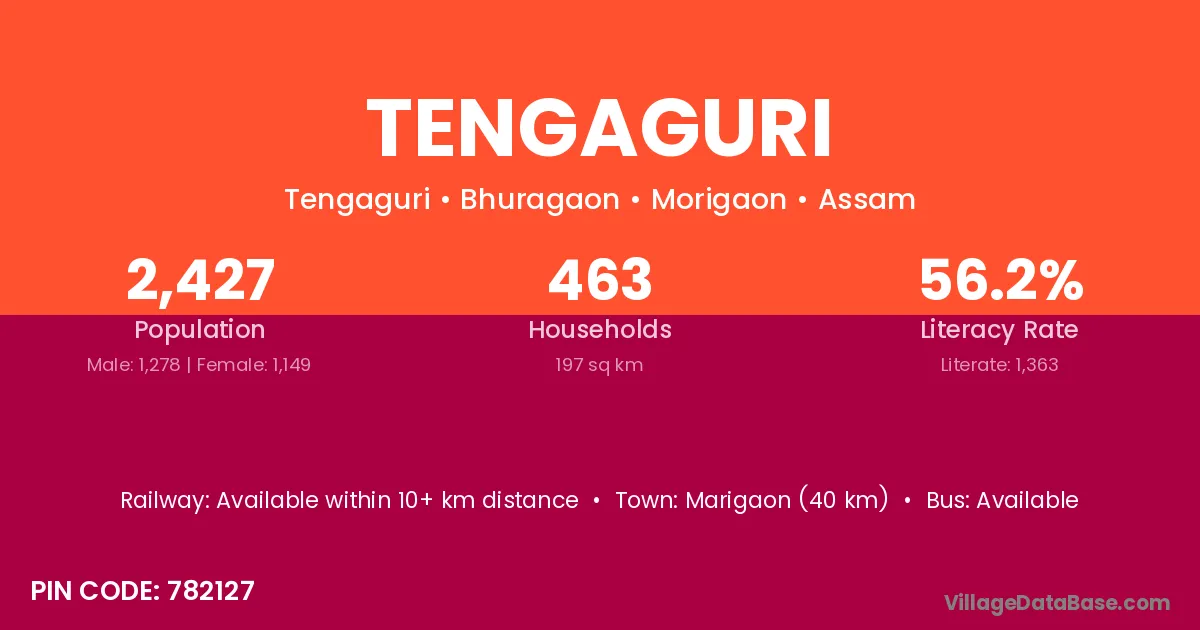 Marigaon (40 km) is the nearest town to Tengaguri village for major economic activities and is located approximately 40 km away.