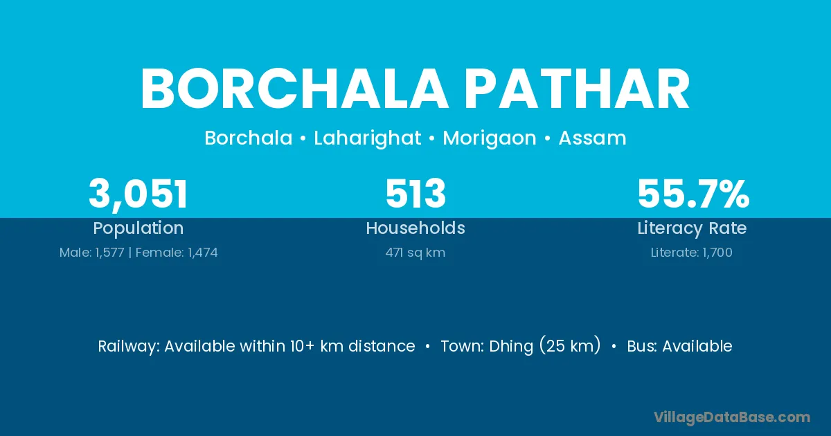 Dhing (25 km) is the nearest town to Borchala Pathar village for major economic activities and is located approximately 25 km away.