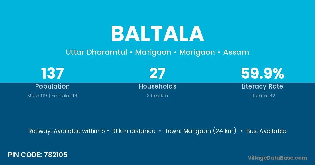 Marigaon (24 km) is the nearest town to Baltala village for major economic activities and is located approximately 24 km away.