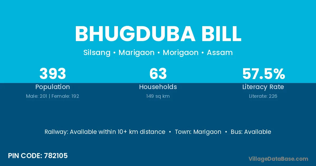 Bhugduba Bill village has a total population of 393 people, of which 201 are males and 192 are females.