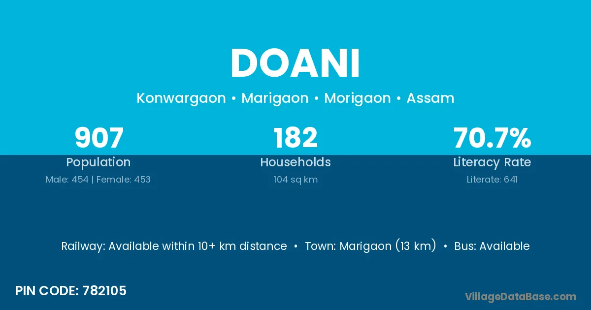 Marigaon (13 km) is the nearest town to Doani village for major economic activities and is located approximately 13 km away.