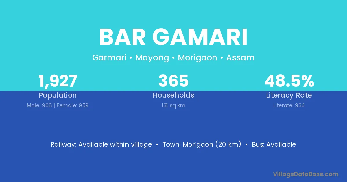 Morigaon (20 km) is the nearest town to Bar Gamari village for major economic activities and is located approximately 20 km away.