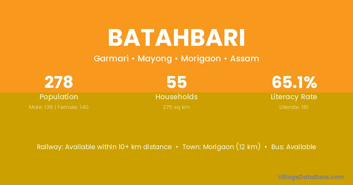 Morigaon (12 km) is the nearest town to Batahbari village for major economic activities and is located approximately 12 km away.