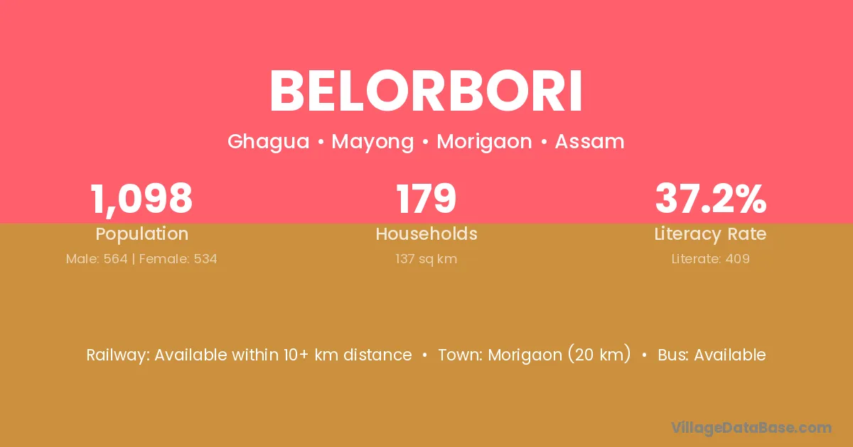 Morigaon (20 km) is the nearest town to Belorbori village for major economic activities and is located approximately 20 km away.