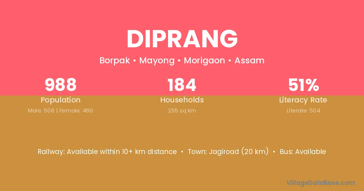 Jagiroad (20 km) is the nearest town to Diprang village for major economic activities and is located approximately 20 km away.