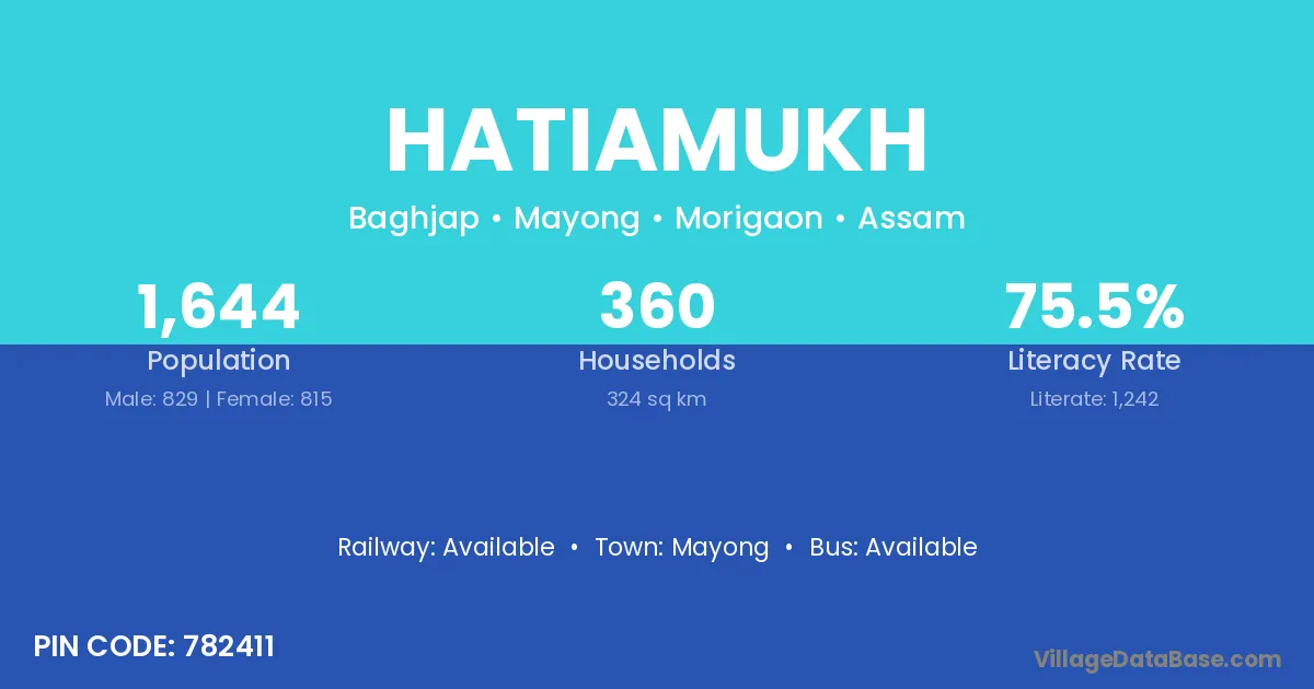 Hatiamukh village has a total population of 1,644 people, of which 829 are males and 815 are females.