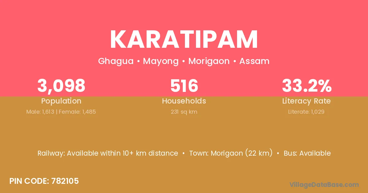 Morigaon (22 km) is the nearest town to Karatipam village for major economic activities and is located approximately 22 km away.