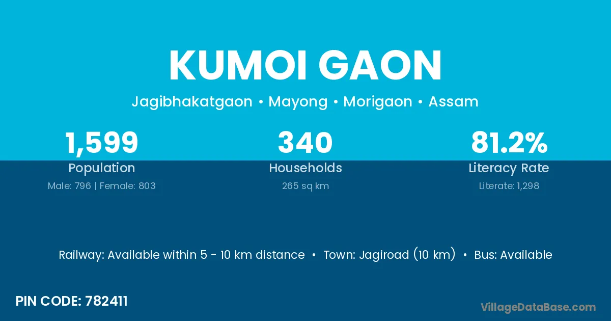 Jagiroad (10 km) is the nearest town to Kumoi Gaon village for major economic activities and is located approximately 10 km away.