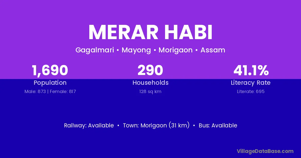 Morigaon (31 km) is the nearest town to Merar Habi village for major economic activities and is located approximately 31 km away.