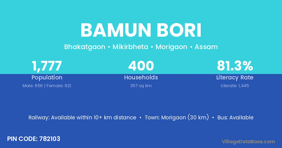Morigaon (30 km) is the nearest town to Bamun Bori village for major economic activities and is located approximately 30 km away.