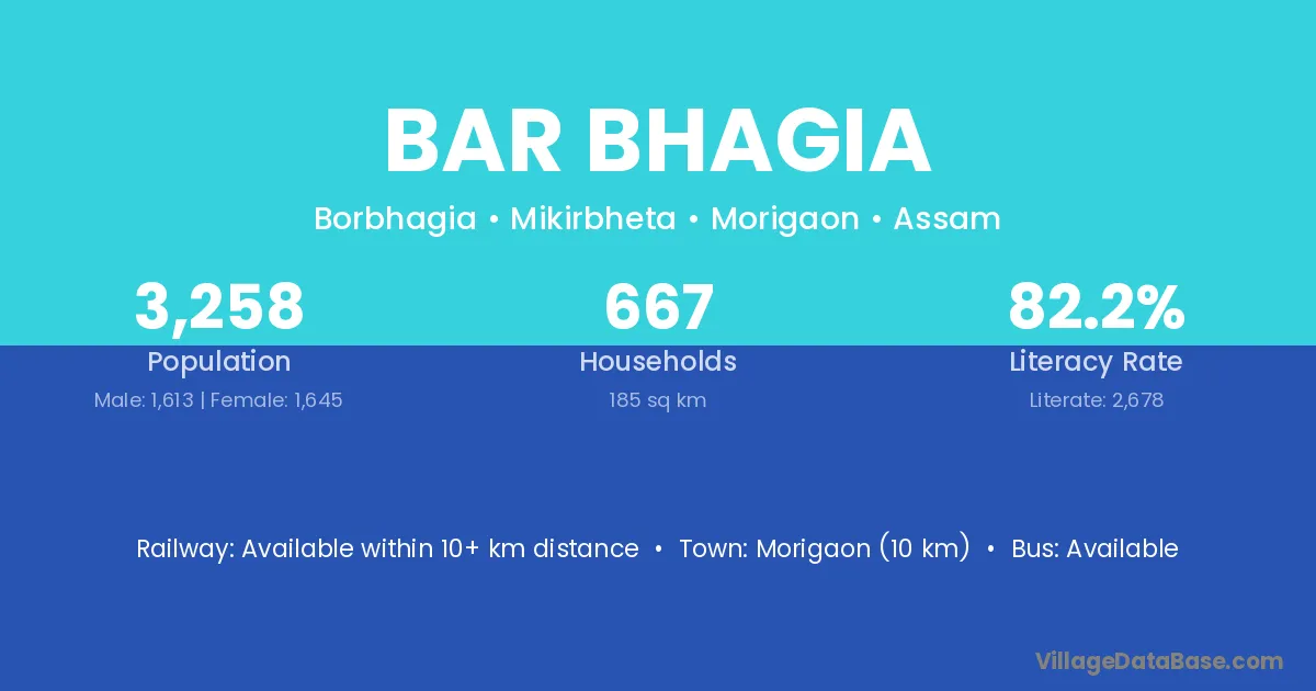 Morigaon (10 km) is the nearest town to Bar Bhagia village for major economic activities and is located approximately 10 km away.