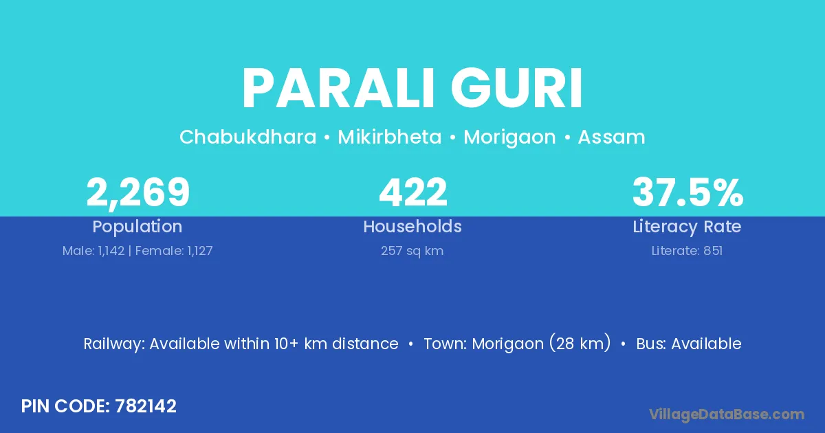 Morigaon (28 km) is the nearest town to Parali Guri village for major economic activities and is located approximately 28 km away.