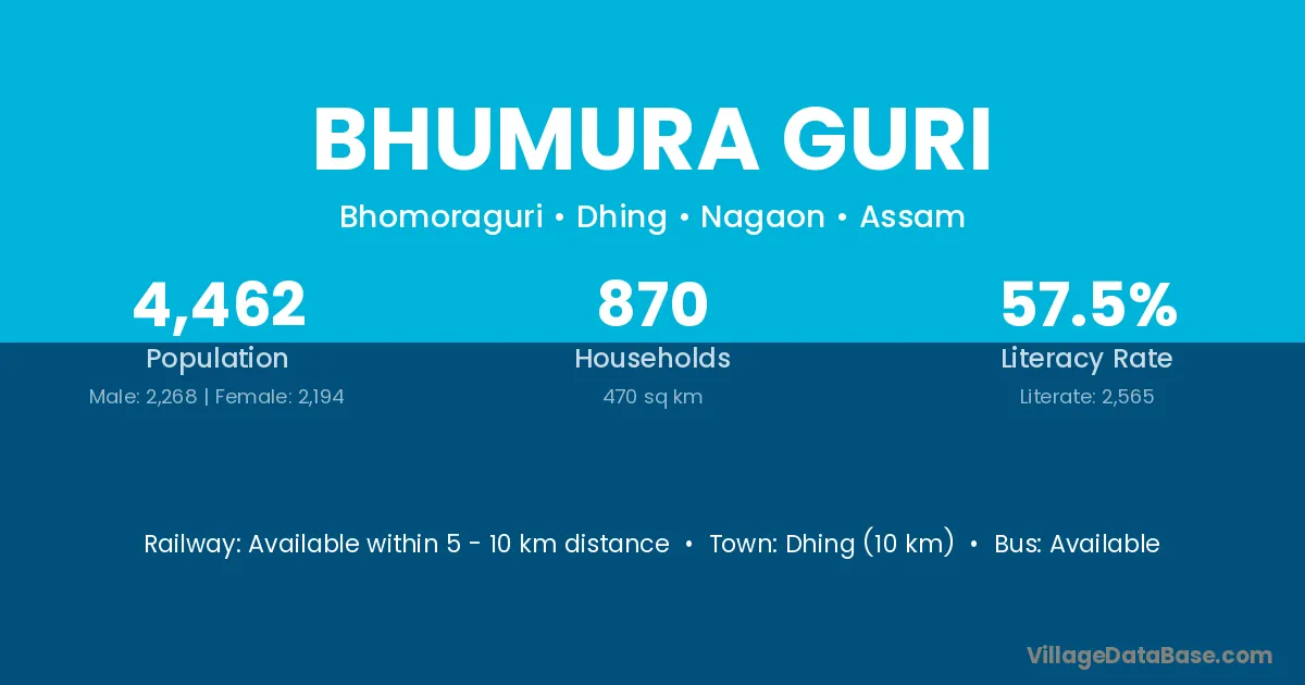 Dhing (10 km) is the nearest town to Bhumura Guri village for major economic activities and is located approximately 10 km away.