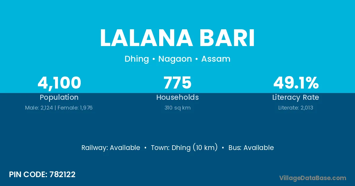 Dhing (10 km) is the nearest town to Lalana Bari village for major economic activities and is located approximately 10 km away.