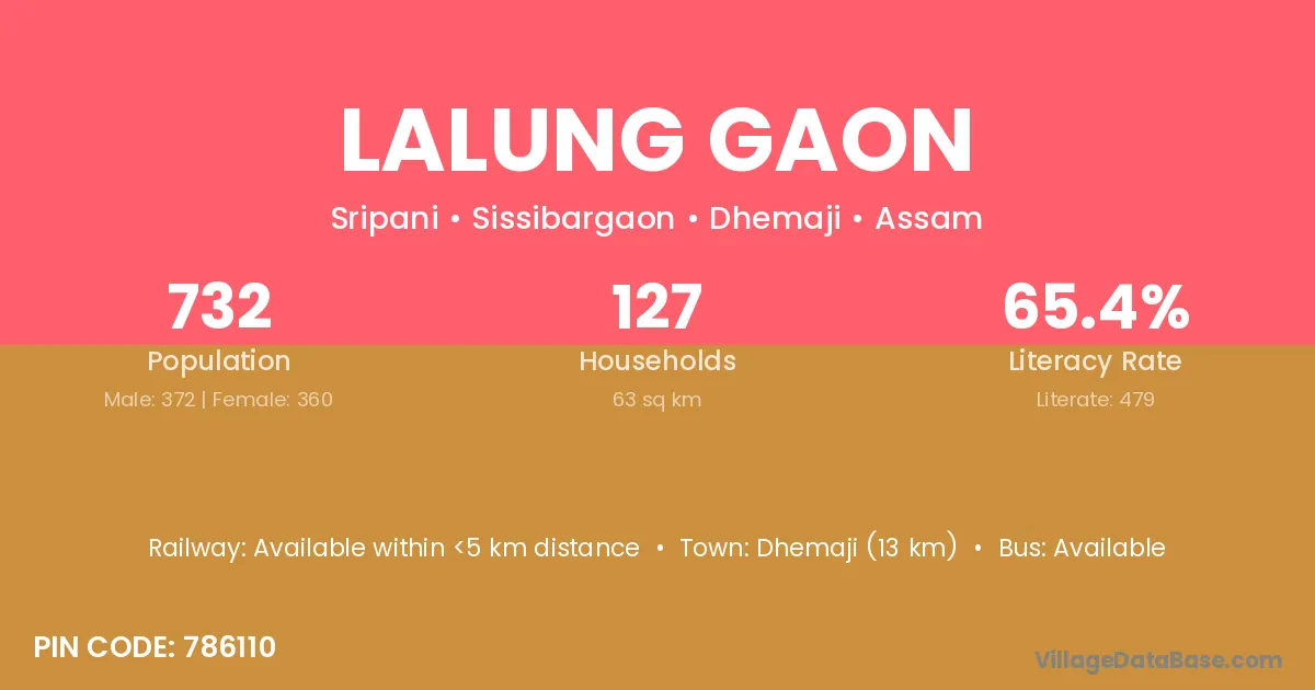 Dhing (13 km) is the nearest town to Lalung Gaon village for major economic activities and is located approximately 13 km away.
