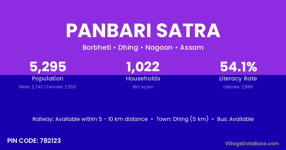Dhing (5 km) is the nearest town to Panbari Satra village for major economic activities and is located approximately 5 km away.