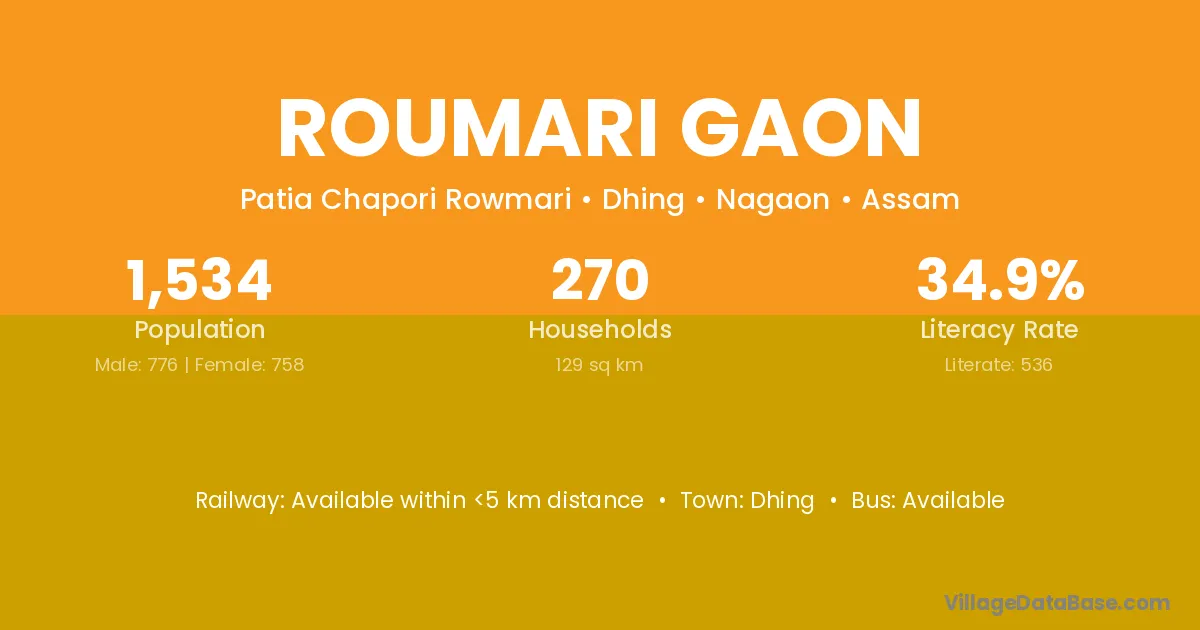 Dhing is the nearest town to Roumari Gaon village for major economic activities