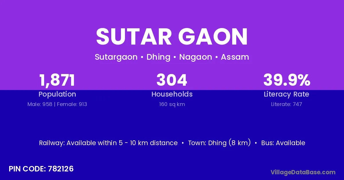 Dhing (8 km) is the nearest town to Sutar Gaon village for major economic activities and is located approximately 8 km away.