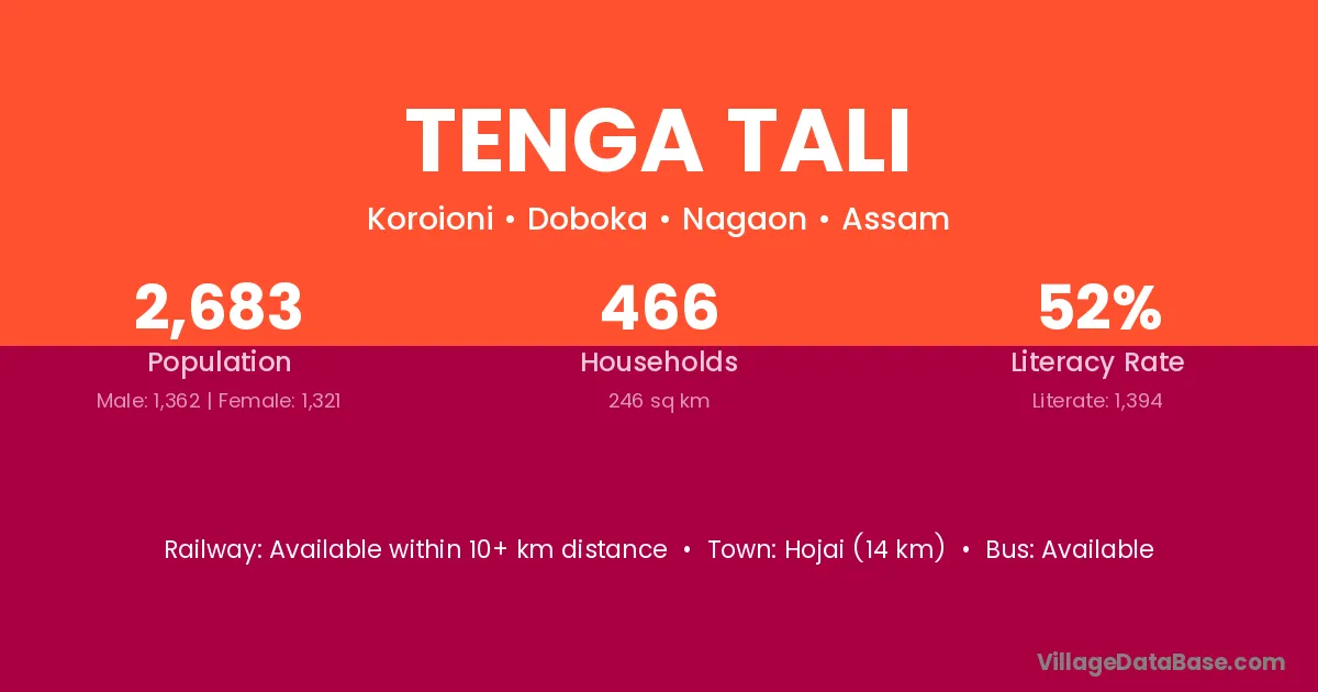 Hojai (14 km) is the nearest town to Tenga Tali village for major economic activities and is located approximately 14 km away.
