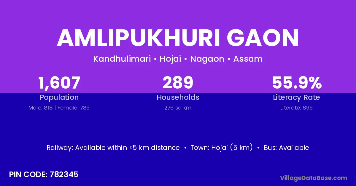 Hojai (5 km) is the nearest town to Amlipukhuri Gaon village for major economic activities and is located approximately 5 km away.