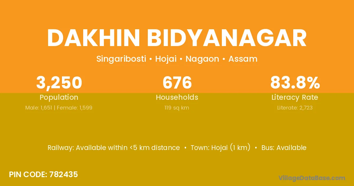 Hojai (1 km) is the nearest town to Dakhin Bidyanagar village for major economic activities and is located approximately 1 km away.
