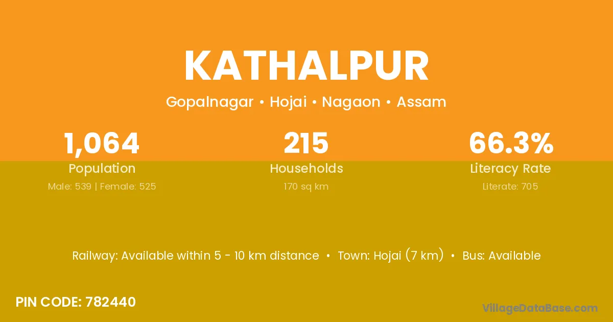 Hojai (7 km) is the nearest town to Kathalpur village for major economic activities and is located approximately 7 km away.