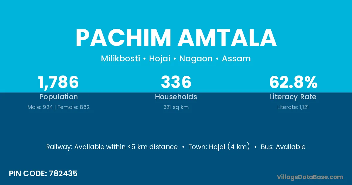 Hojai (4 km) is the nearest town to Pachim Amtala village for major economic activities and is located approximately 4 km away.