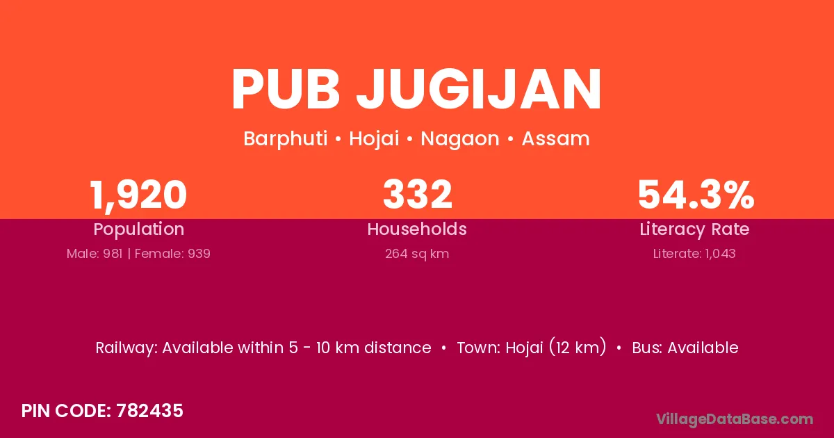 Hojai (12 km) is the nearest town to Pub Jugijan village for major economic activities and is located approximately 12 km away.