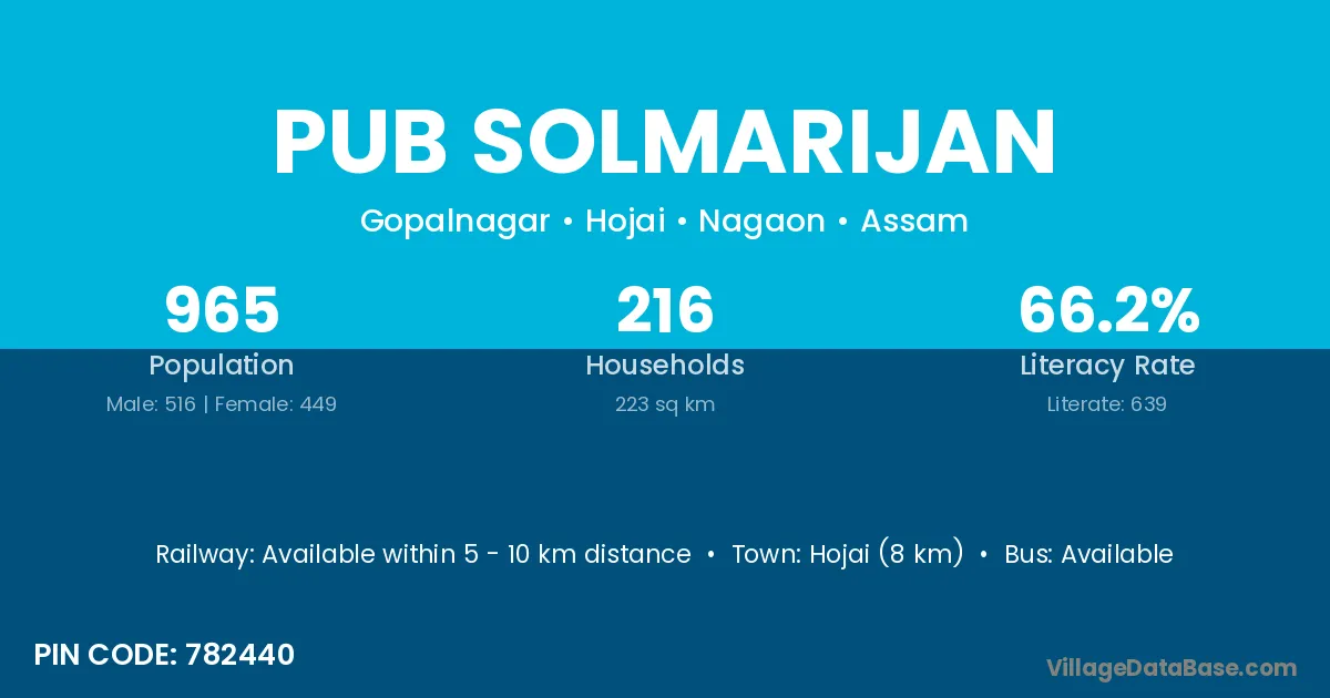 Hojai (8 km) is the nearest town to Pub Solmarijan village for major economic activities and is located approximately 8 km away.