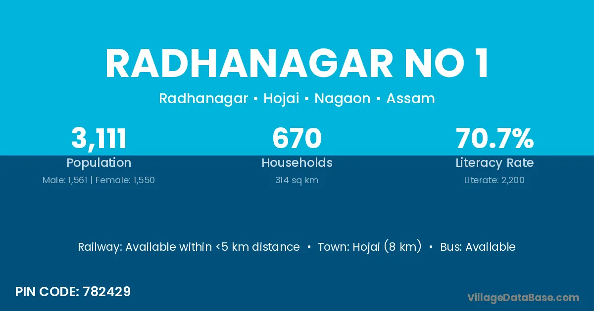 Hojai (8 km) is the nearest town to Radhanagar No 1 village for major economic activities and is located approximately 8 km away.