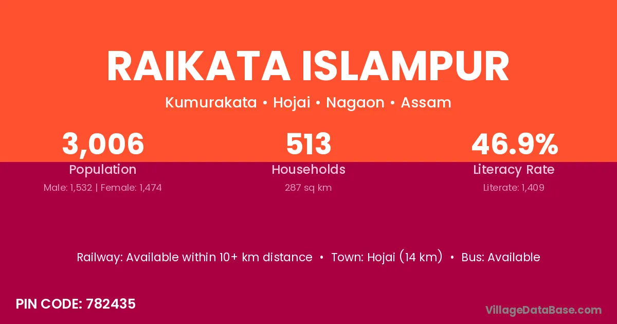 Hojai (14 km) is the nearest town to Raikata Islampur village for major economic activities and is located approximately 14 km away.