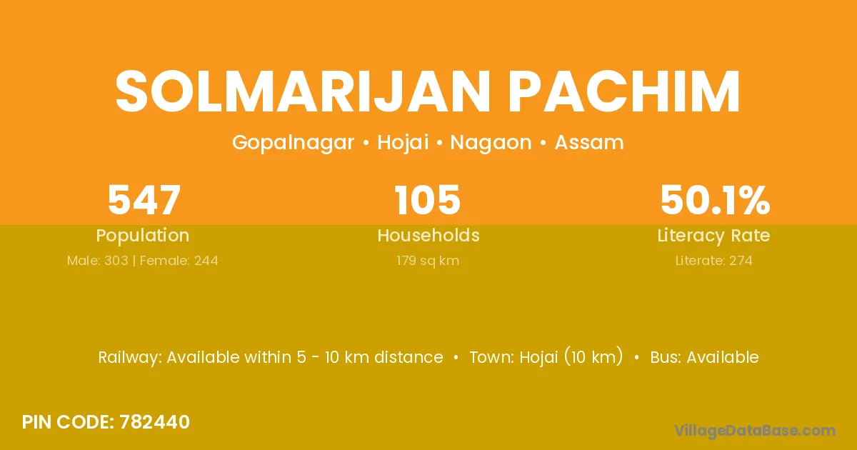 Hojai (10 km) is the nearest town to Solmarijan Pachim village for major economic activities and is located approximately 10 km away.