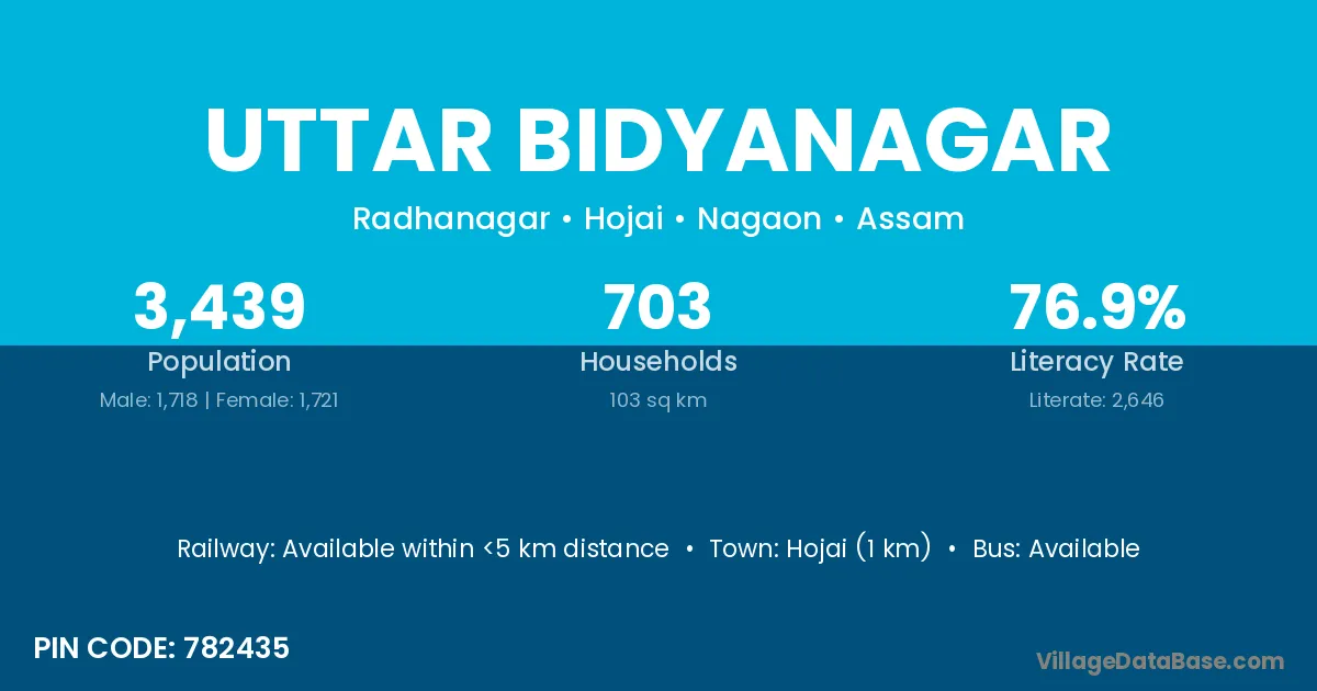 Hojai (1 km) is the nearest town to Uttar Bidyanagar village for major economic activities and is located approximately 1 km away.