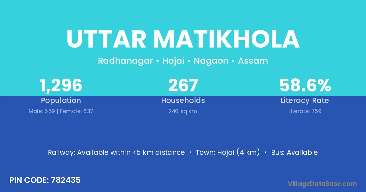 Hojai (4 km) is the nearest town to Uttar Matikhola village for major economic activities and is located approximately 4 km away.