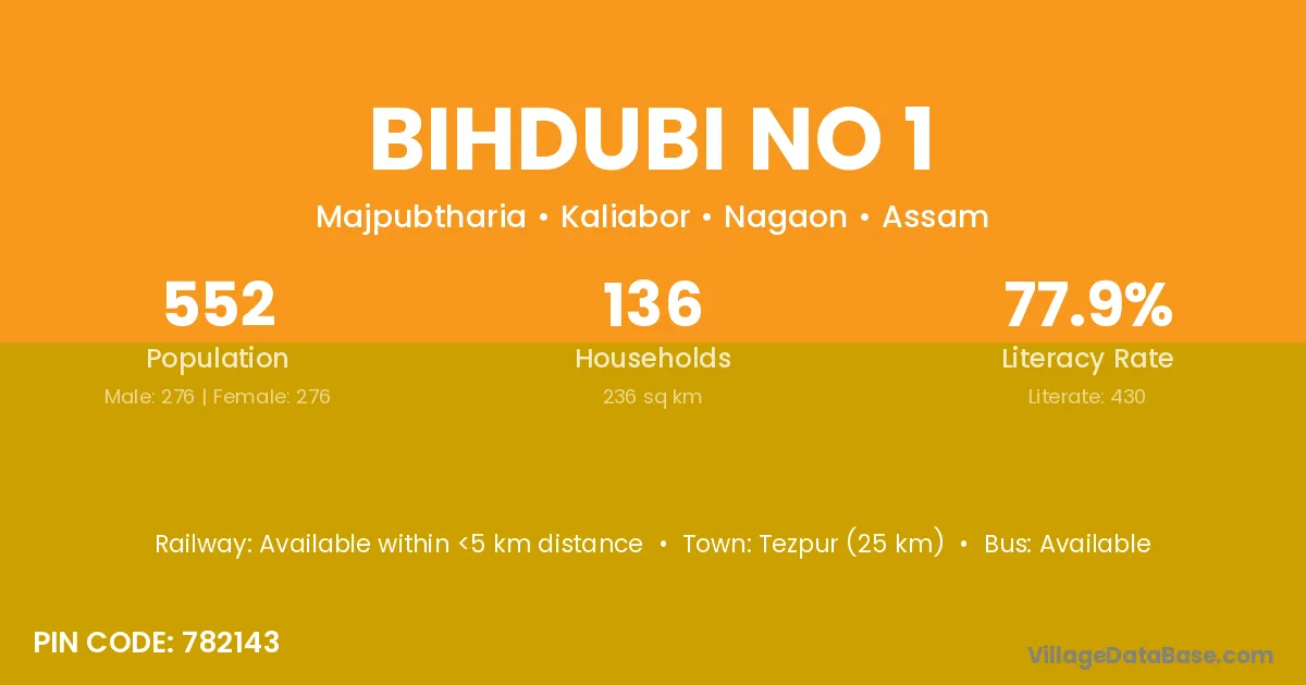 Tezpur (25 km) is the nearest town to Bihdubi No 1 village for major economic activities and is located approximately 25 km away.