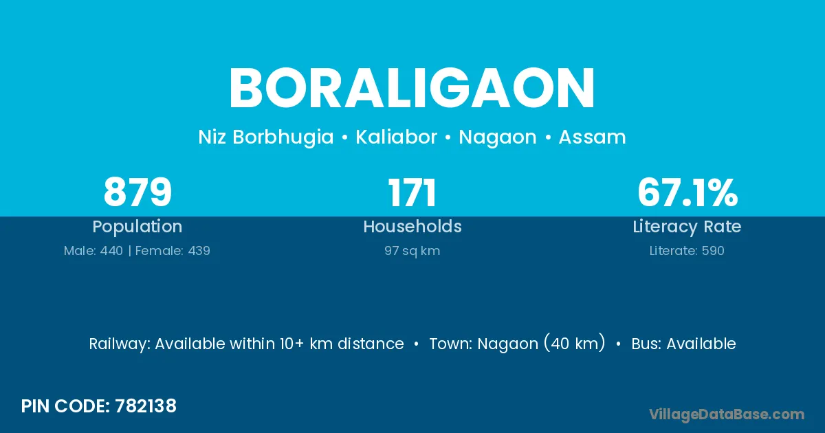 Nagaon (40 km) is the nearest town to Boraligaon village for major economic activities and is located approximately 40 km away.