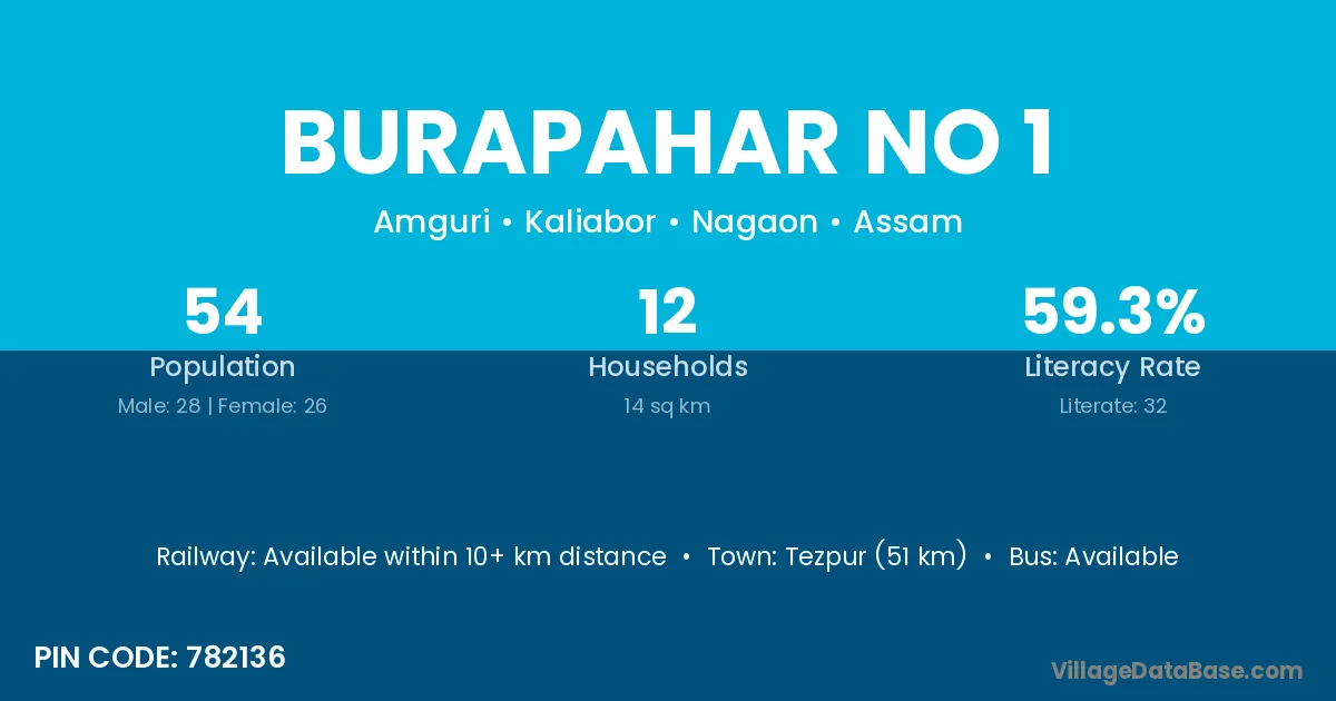 Tezpur (51 km) is the nearest town to Burapahar No 1 village for major economic activities and is located approximately 51 km away.