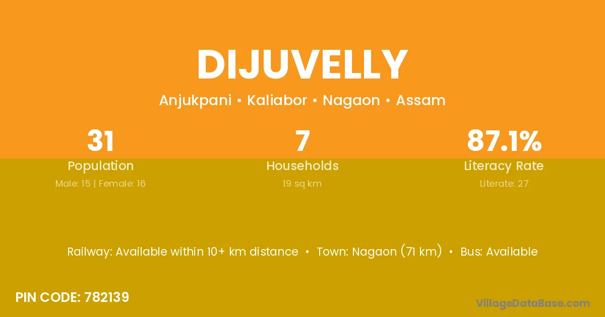 Nagaon (71 km) is the nearest town to Dijuvelly village for major economic activities and is located approximately 71 km away.